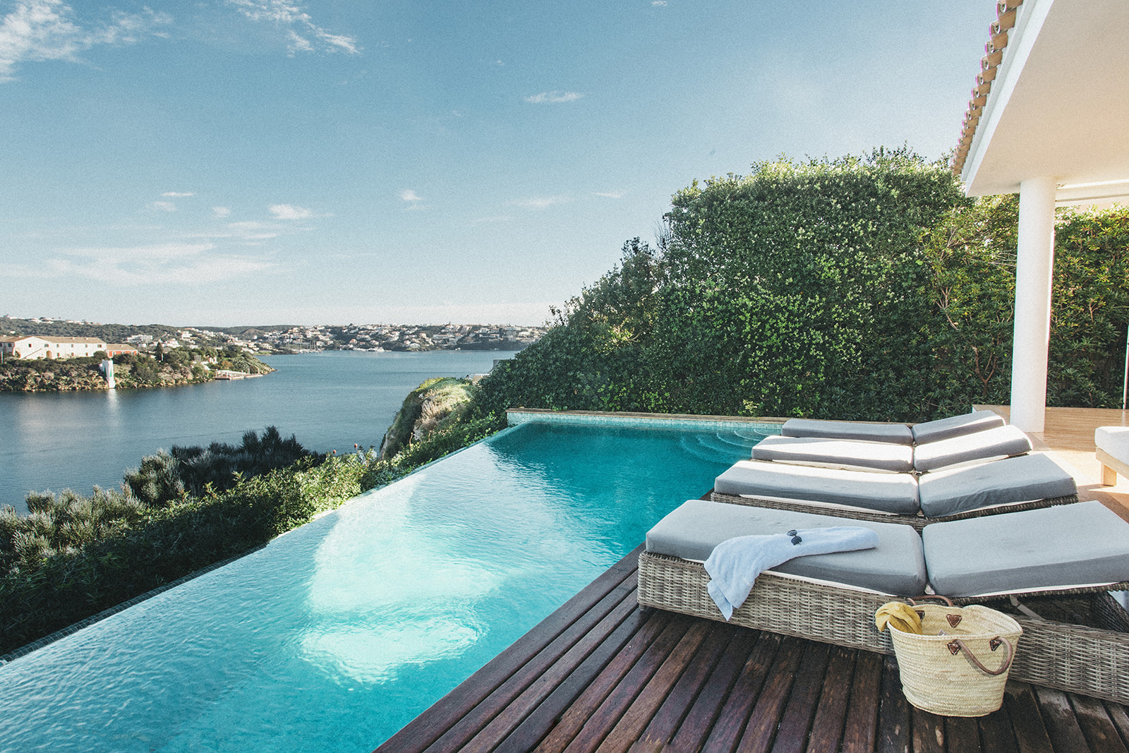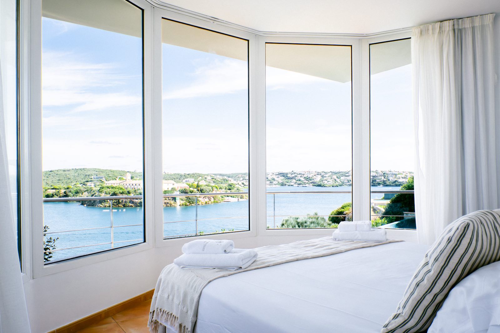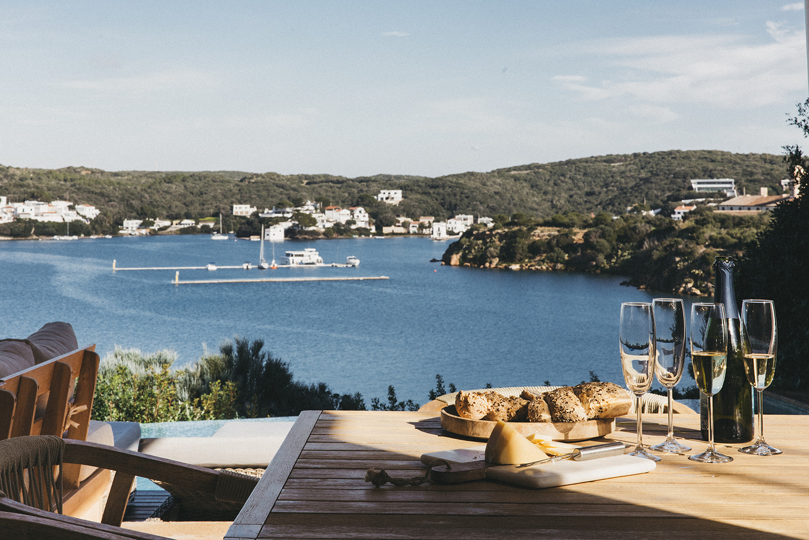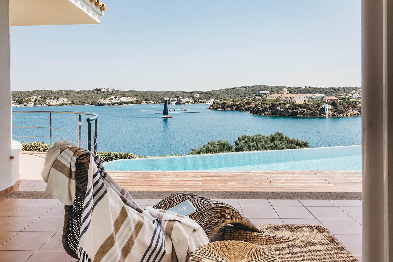 Casa Bárbara se asienta sobre el acantilado de Cala Figuerassa en el puerto de Mahón, con vistas espectaculares a la Isla del Rey y una luz que acompaña durante todo el día.